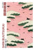 Dit schilderij toont een roze achtergrond met gestileerde groene en witte wolken en zwarte vogels tijdens de vlucht.