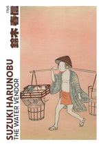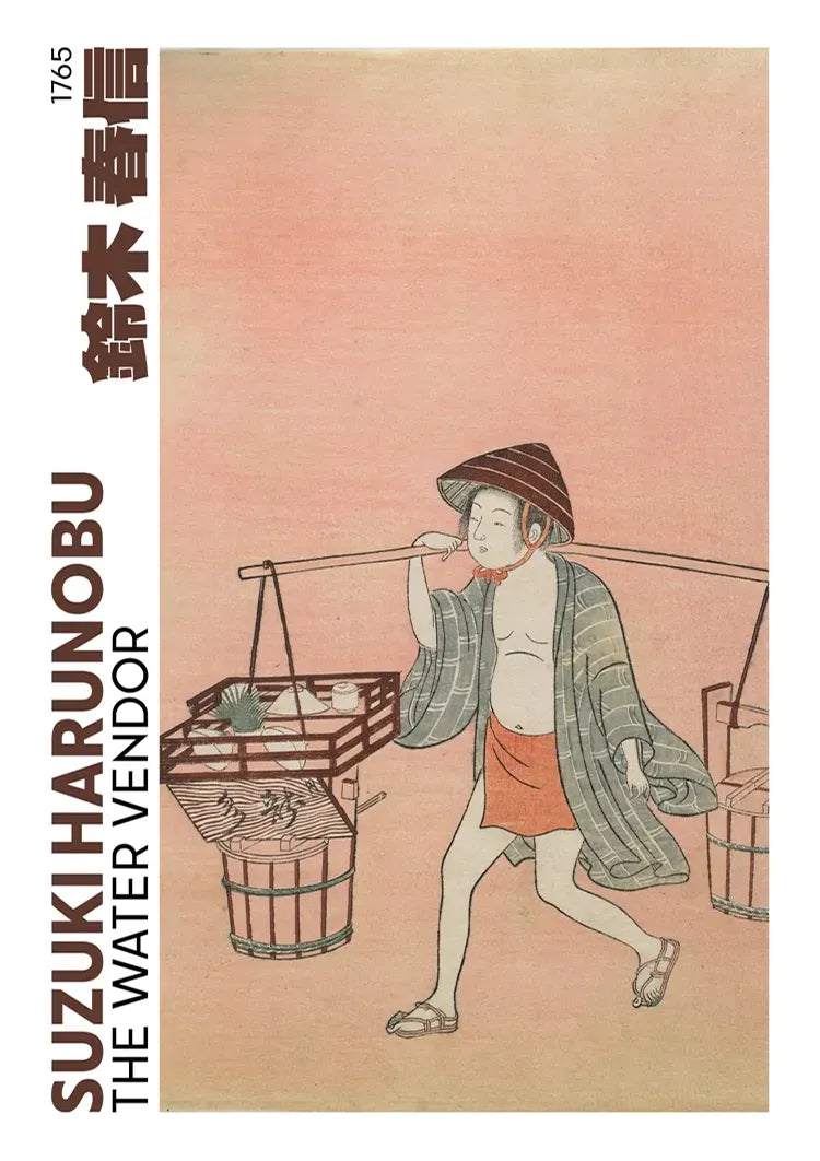 Dit schilderij "The Water Vendor" van Suzuki Harunobu uit 1765 toont een persoon die traditionele kledij en een hoed draagt terwijl hij een juk met emmers water draagt. De achtergrond is een gedempte roze tint.