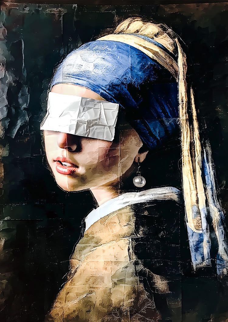 Een moderne twist op het iconische Vermeer-portret, met ogen bedekt door een gevouwen stuk papier.