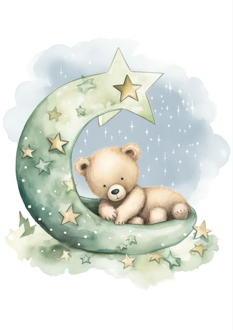 Dit charmante schilderij vangt een schattige teddybeer die zich koestert op een groene halve maan, omringd door fonkelende sterren. De zachte, wolkachtige achtergrond voegt een dromerig tintje toe.