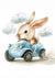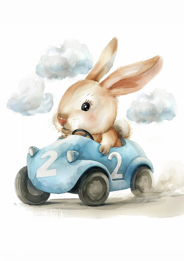 Dit schilderij toont een konijn dat een kleine blauwe raceauto bestuurt met het nummer 2 erop. Het konijn lijkt gefocust terwijl hij rijdt.