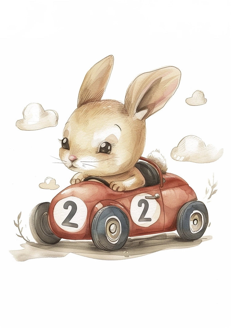 Dit schilderij toont een konijn dat een kleine rode raceauto bestuurt met het nummer 2 erop. Het konijn lijkt gefocust terwijl hij rijdt.