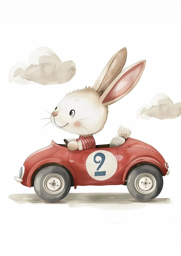 Dit schilderij toont een lief konijntje dat een kleine rode raceauto bestuurt met het nummer 2 erop. Het konijn rijdt tevreden rond.