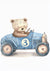 Dit schilderij toont een bruine teddybeer die een kleine blauwe vintage raceauto bestuurt met het nummer 3 op de zijkant. De beer kijkt recht vooruit met zijn poten op het stuur.