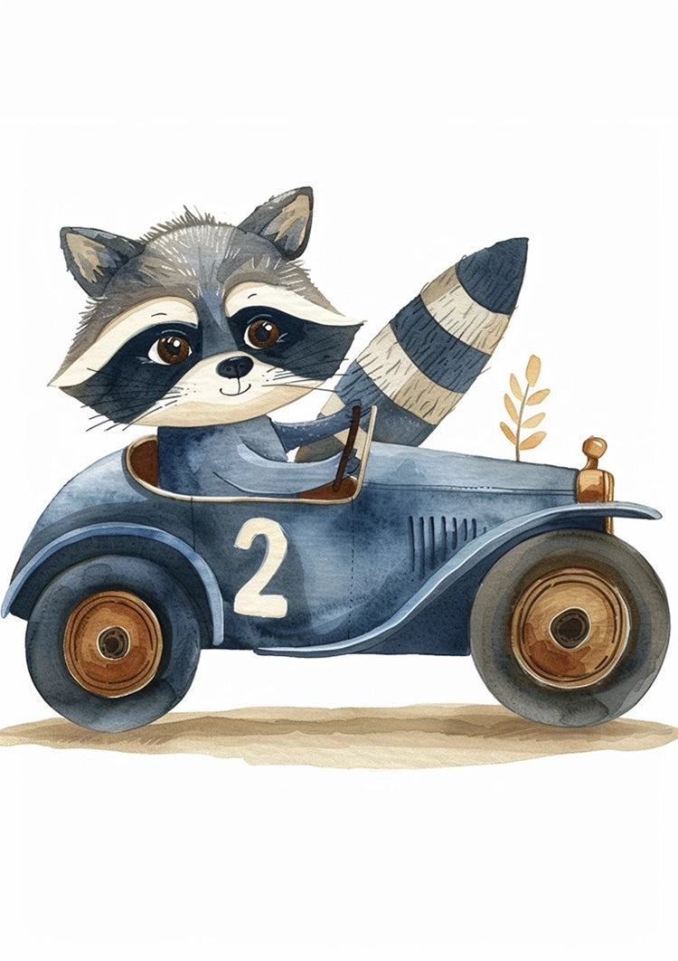 Dit schilderij vangt een wasbeer in een coole, blauwe vintage auto met het nummer 2 op de zijkant.