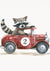 Dit schilderij vangt een levendige scène van een wasbeer achter het stuur van een rode vintage auto, compleet met het nummer 2 op de deur. Een charmante afbeelding van een avontuurlijke rit!