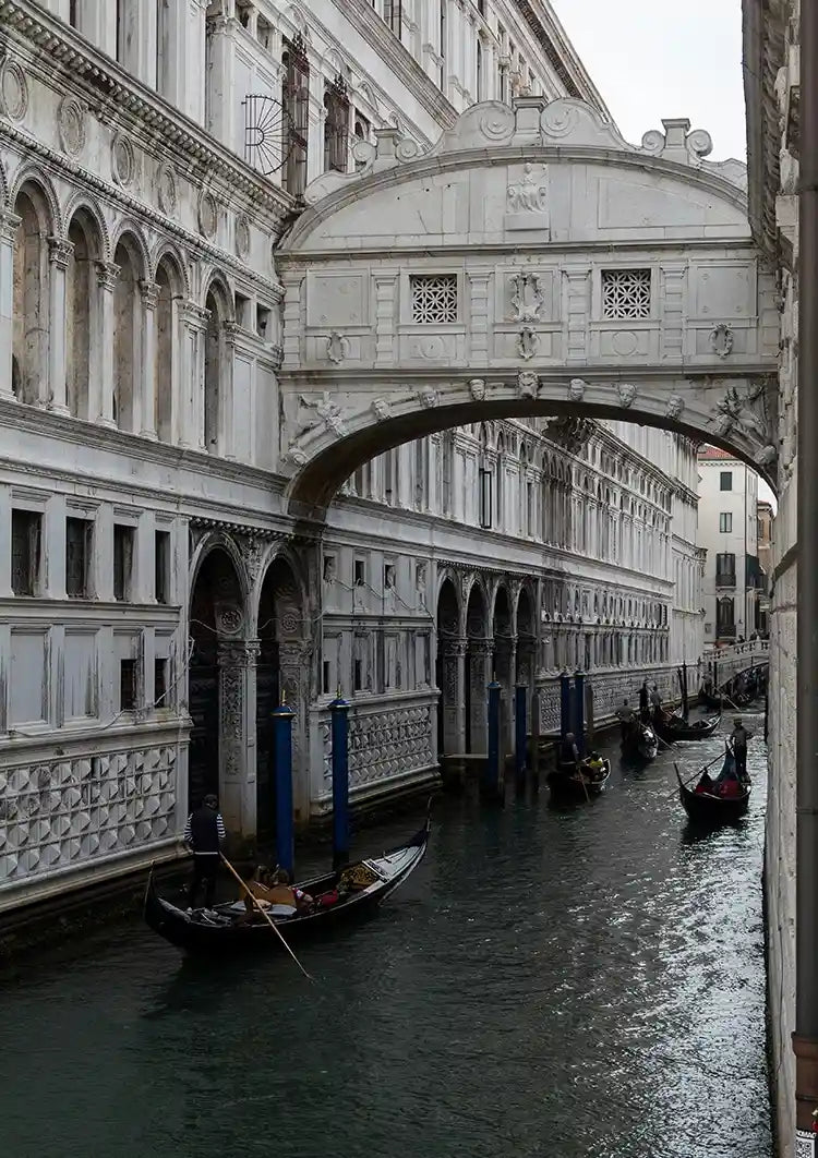 Dit schilderij toont de Brug der Zuchten in Venetië, Italië, met een gondel die door het smalle kanaal vaart.