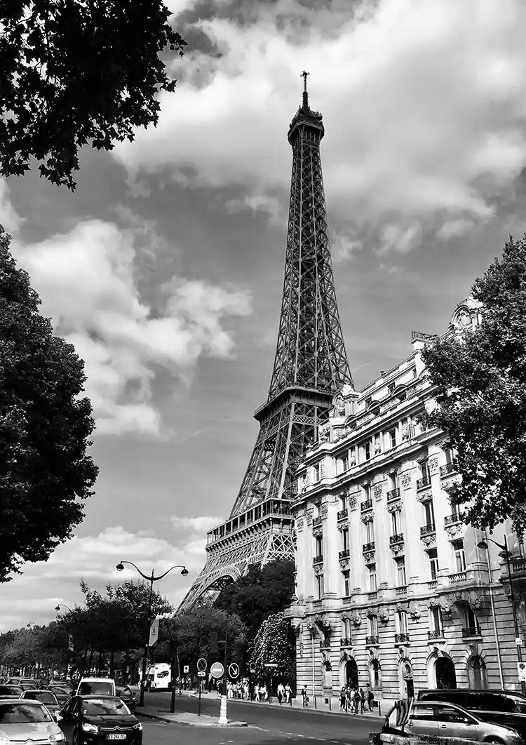 Een zwart-wit schilderij van de Eiffeltoren gezien vanuit een straat met elegante gebouwen en auto's.