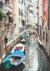 Dit schilderij toont een smal kanaal in Venetië met langs de zijkanten afgemeerde boten.