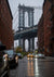 Dit schilderij toont een iconisch uitzicht op de Manhattan Bridge tussen twee roodbruine bakstenen gebouwen.
