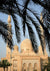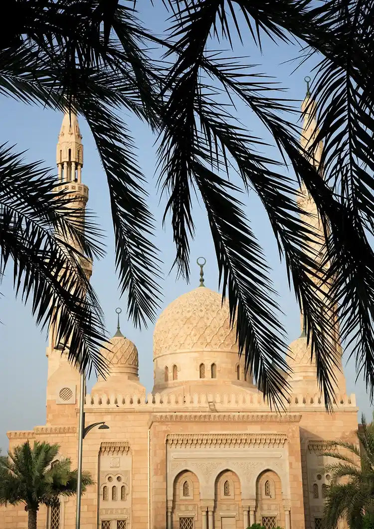 Dit schilderij toont een moskee met sierlijke architectuur, omlijst door het silhouet van palmbladeren tegen een heldere hemel.