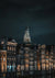 Dit schilderij toont een nachtelijk tafereel van Amsterdam met verlichte gebouwen en een toren tegen een donkere hemel.