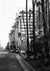 Op dit zwart-wit schilderij zie je een gebouw staan met daarvoor palmbomen.