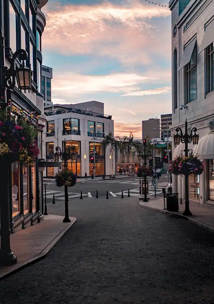 Een schilderij van een rustige straat in de schemering met gebouwen versierd met hangende manden met bloemen.