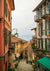 Dit schilderij toont een smalle, aflopende straat met kleurrijke gebouwen met balkons, sommige versierd met planten.