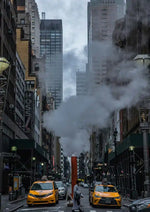 Dit schilderij toont een straat in een stedelijk stadsgezicht met hoogbouw, twee gele taxi's en een voetganger die de weg oversteekt, terwijl stoom opstijgt.