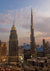 Dit schilderij toont een uitzicht in de schemering met de Burj Khalifa en de omliggende wolkenkrabbers in Dubai.