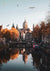 Dit schilderij toont een uitzicht over Amsterdam met een gracht die historische gebouwen en bomen weerspiegelt.