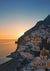 Dit schilderij toont een zonsondergang boven een kustplaats met lagen kleurrijke huizen ingebouwd in de heuvel.
