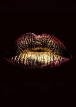 Dit schilderij toont een paar lippen beschilderd met metallic kleuren, met tinten goud, brons en paars. De achtergrond is volledig zwart, waardoor een sterk contrast ontstaat dat de gedetailleerde textuur van de lippen benadrukt.