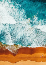 Een schilderij vanaf boven, met zicht op zand en zee.