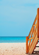 Een schilderij op een strand met een trapje.  Het is een leeg strand.