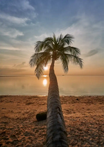 Een schilderij waar de focus ligt op de palmboom met op de achtergrond de zon.