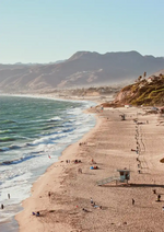 Een schilderij van een niet druk bezochte kustlijn met een geweldig uitzicht.