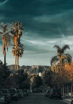 Dit schilderij toont een straat met palmen die leidt naar het Hollywood-bord in de verte.