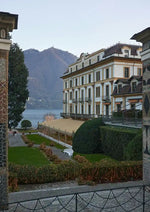 Dit schilderij toont een elegant gebouw met meerdere verdiepingen en balkons, gelegen in een verzorgde tuin met gesnoeide heggen.