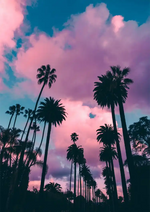 Een schilderij met roze wolken, en daaronder hoge palmbomen.