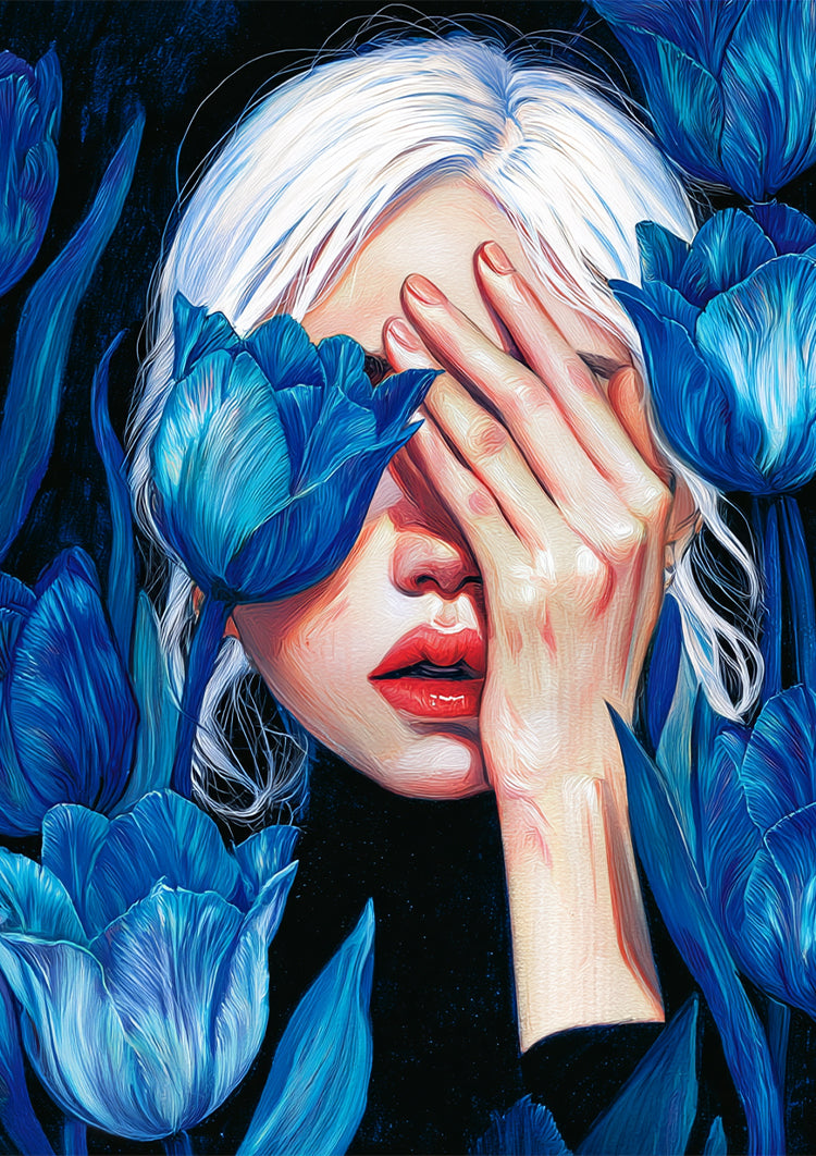 Een fragiele figuur verscholen tussen diepe blauwe tulpen, waar kleur en emotie samen een dromerige sfeer creëren.