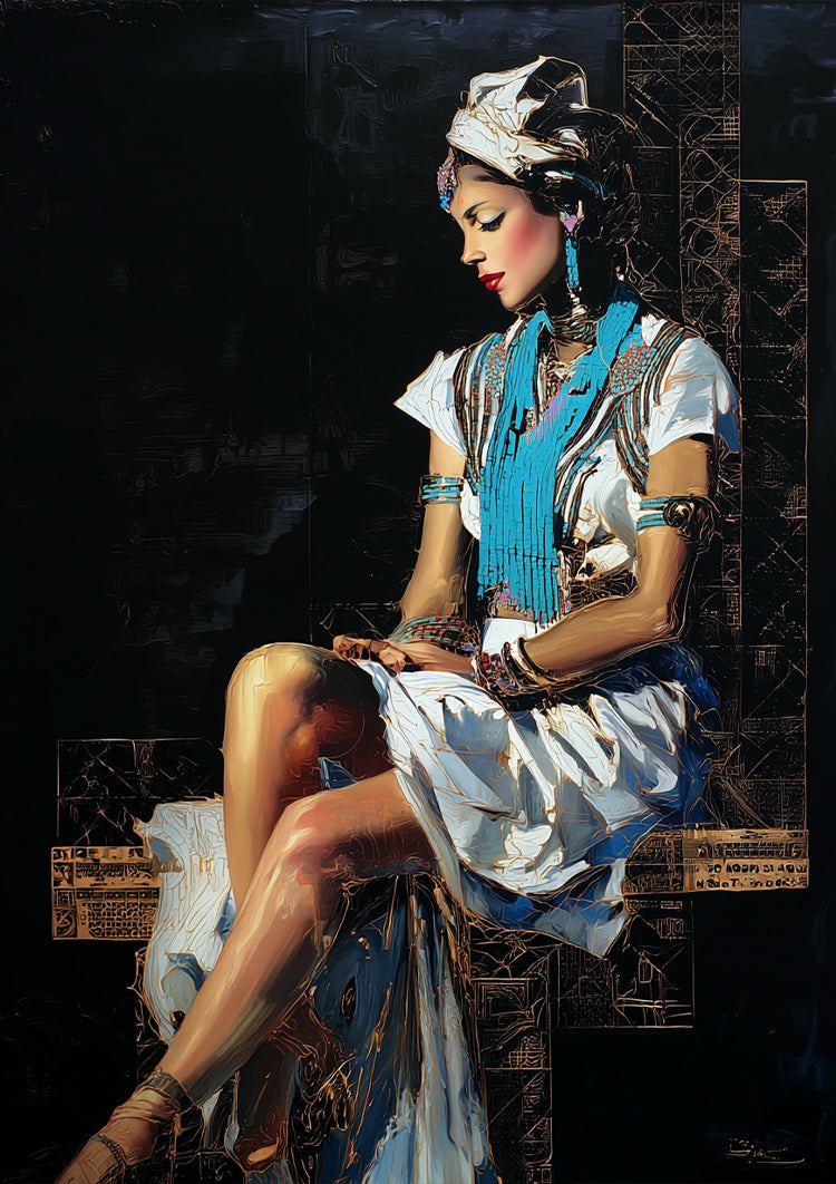 Een statige vrouw in wit en turquoise, geïnspireerd op oude woestijnrijken, straalt kracht en rust uit.