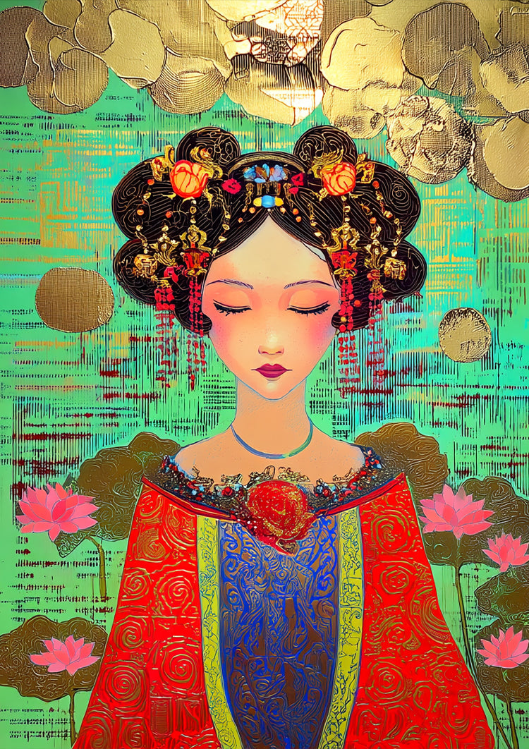 Een rijk gedetailleerde, kleurrijke voorstelling van een oosterse vorstin, omringd door lotusbloemen en gouden patronen.