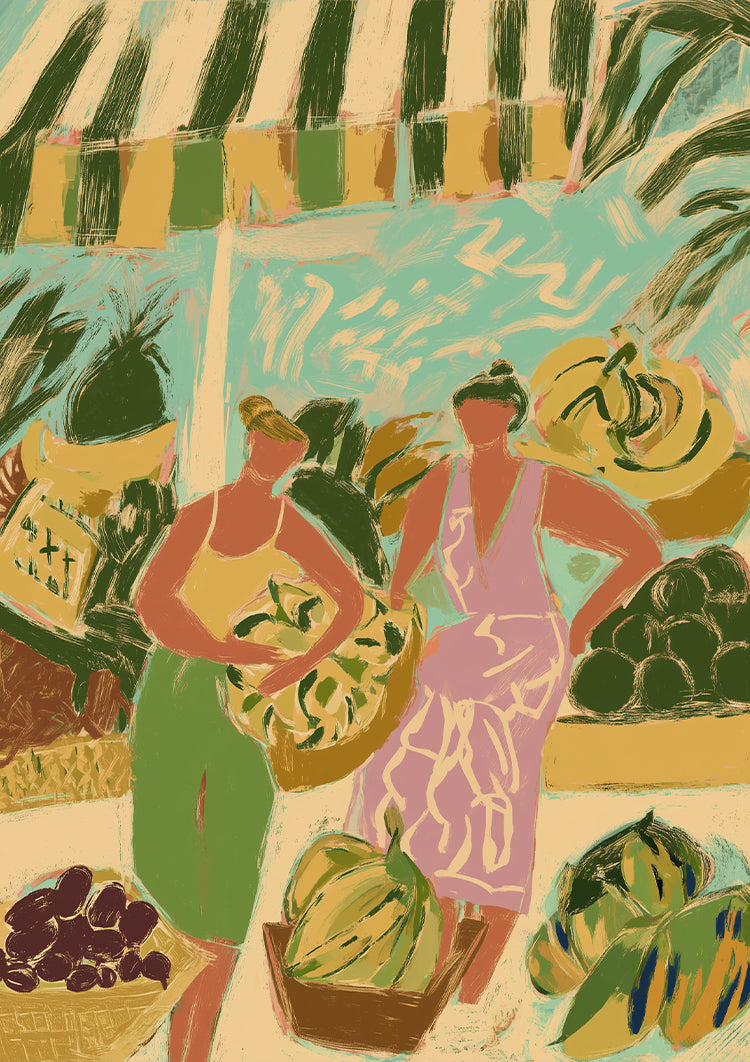 Vrolijk geschilderde figuren verkopen fruit op een zonovergoten markt.