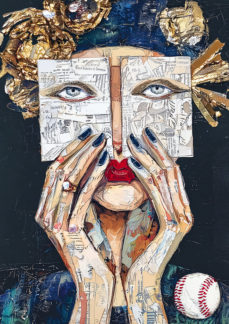 Een gezicht, opgebouwd uit krantenpapier, dat nieuwsgierig de wereld inkijkt.