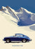 Een blauwe Porsche in een minimalistisch winterlandschap met witte bergen op de achtergrond.