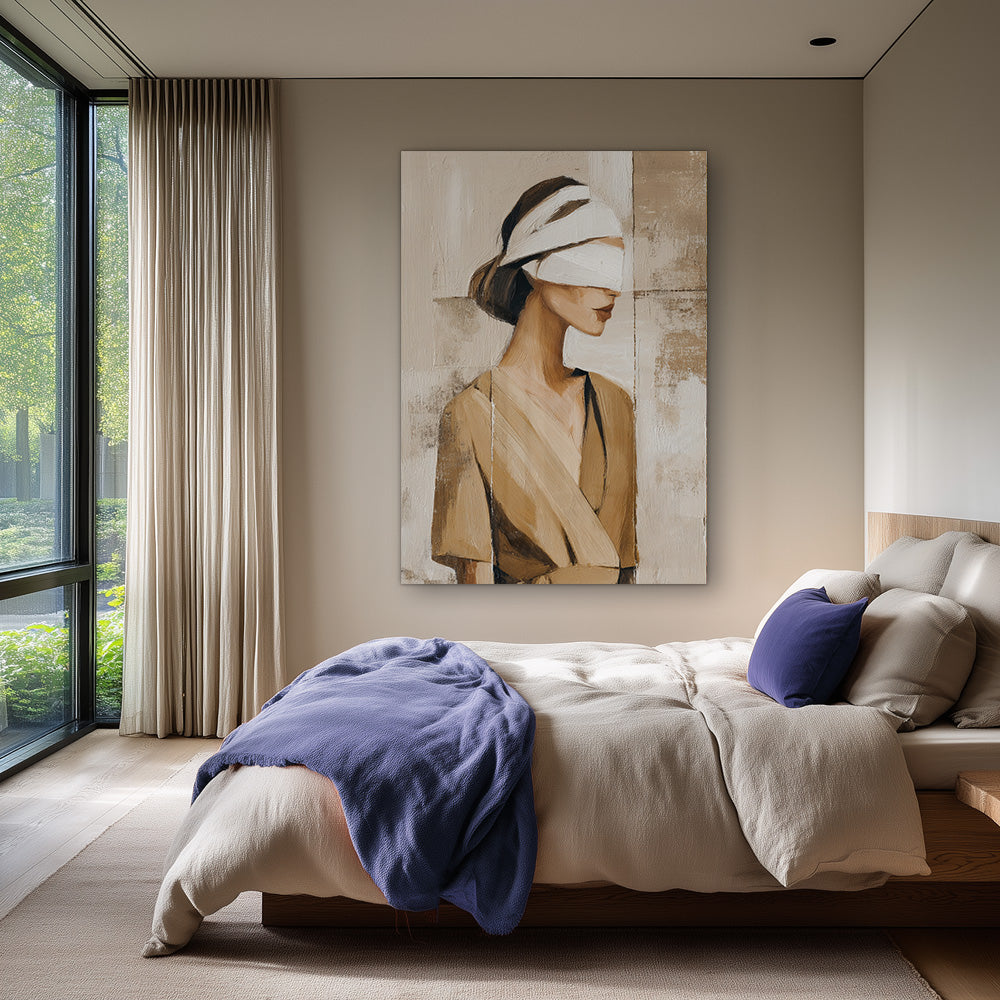 • In de slaapkamer werkt een stuk van minimaal 120 cm breed vaak het best. Of speel met een creatieve compositie van meerdere werken.