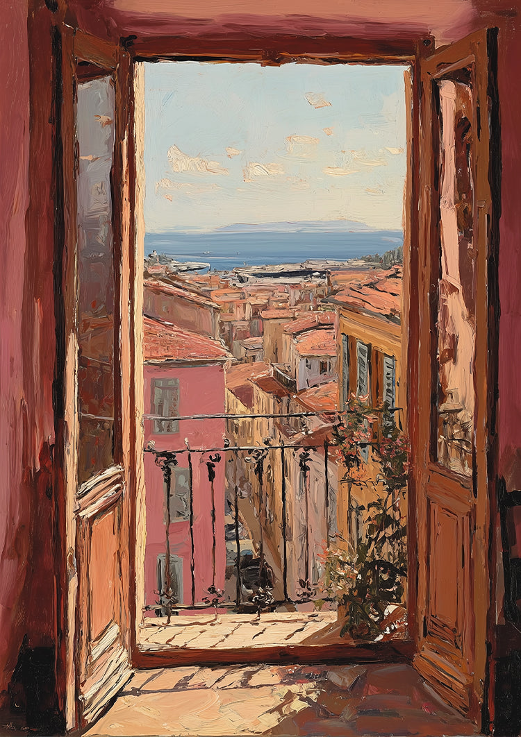 Vanuit een openstaand balkon kijk je uit over een zonnige kustplaats met rode daken en blauwe zee.