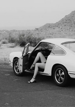 Dit schilderij toont een zwart-witfoto van een dame die in een auto zit met de deur open. De auto staat langs de kant van de weg geparkeerd met een dor landschap op de achtergrond.