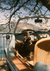 Dit schilderij toont het binnenaanzicht van een schattig Italiaans autotje met open dak, geparkeerd naast een schilderachtig meer.