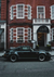 Dit schilderij toont een klassiek zwarte Porsche Turbo geparkeerd voor een rood bakstenen gebouw met witte ramen en het nummer 108 prominent boven de ingang.
