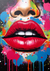 Dit schilderij toont artistieke graffiti van felrode lippen op een zwarte achtergrond, bespat met levendige, veelkleurige verf.