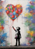 Dit schilderij toont een graffitikunstwerk met een kind in silhouet dat omhoog reikt naar een grote hartvormige ballon met meerdere Ballonnen.