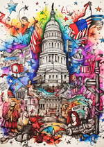 Dit schilderij toont een kleurrijke, levendige illustratie van het Capitool van de Verenigde Staten, omringd door verschillende symbolische Amerikaanse elementen zoals het Vrijheidsbeeld, de Amerikaanse zeearend en de Amerikaanse vlag, afgebeeld.