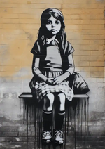 Dit schilderij toont een zwart-witte graffiti van een jong meisje zittend op een bankje, afgebeeld in een realistische stijl.