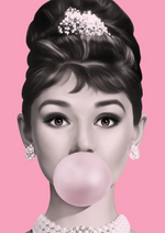 Dit schilderij toont een vrouw met een chique kapsel en parels die een roze kauwgom blaast op een effen roze achtergrond. Haar expressieve ogen en zorgvuldige make-up brengen haar karakter tot leven.