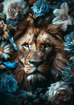 Dit schilderij vangt het majestueuze gezicht van een leeuw, omringd door een weelde van blauwe en witte bloemen, vergezeld door kleurrijke vogels die tussen de bloemen fladderen. De krachtige blik van de leeuw contrasteert prachtig met de levendige achtergrond, wat een meeslepend en contrastrijk beeld oplevert.