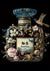 Een decoratief parfumflesje met het opschrift "Exclusive parfum" en de merknaam op een gouden etiket. De fles is versierd met bloemen, vogels en vlinders in een ingewikkeld en artistiek ontwerp tegen een zwarte achtergrond.