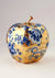 Dit schilderij toont een decoratief object van een grote, gouden appel, versierd met ingewikkelde blauwe bloemenpatronen en een drakenmotief.